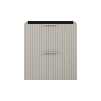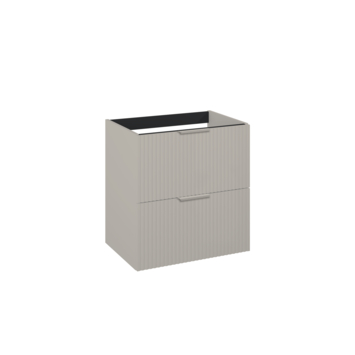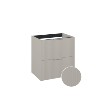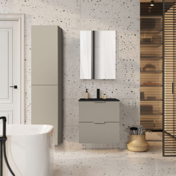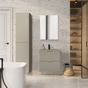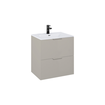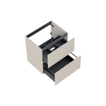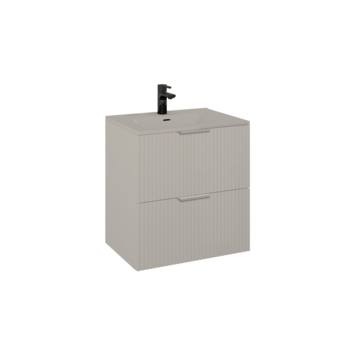 Het meubel is uitgevoerd in taupe afgewerkt hout met een verticale structuur. Dit geeft het meubel een warme en moderne uitstraling. Voor het onderhoud heb je weinig nodig: een zachte doek en milde zeep volstaan. Belangrijk is om het oppervlak droog te maken na contact met water, zodat het meubel mooi blijft.
