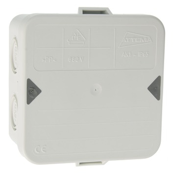 Attema kabeldoos AK1 IP65 voor het op wand of plafond monteren van kabels. Deze witte kabeldoos is stofdicht en spuitwaterdicht (IP65).