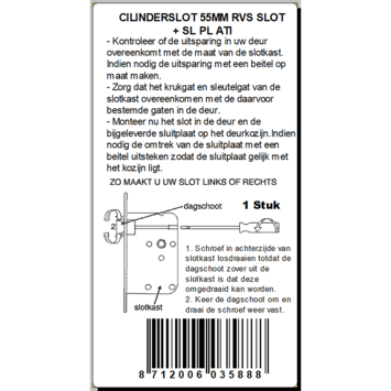 Cilinder slot met RVS (look) voorplaat. De dagschoot is makkelijk om te draaien. De afstand maat is 55mm tussen het hart van het krukgat en het hart van het ronde deel van het cilindergat. De maten van het slot komen overeen met het meest gebruikte slot.