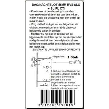 Sleutel, klavier en slaapkamer slot met RVS (look) voorplaat. De dagschoot is makkelijk om te draaien. De afstandsmaat is 56mm tussen het hart van het krukgat en het hart van het ronde deel van het sleutelgat. De maten van het slot komen overeen met het meest gebruikte slot.