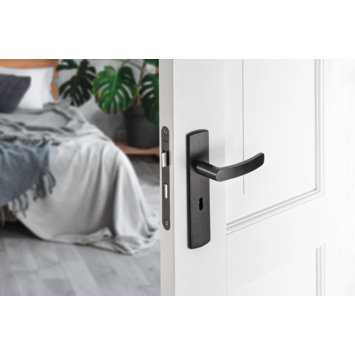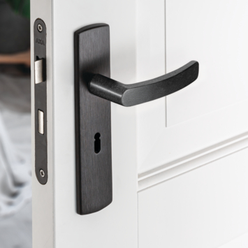 AXA Curve Klik Binnendeurset in een zwart geslepen aluminium uitvoeringis geschikt voor binnendeuren van 38 tot 42 mm dik. De schilden en deurkrukken hebben een licht gebogen vorm en hebben geen zichtbare bevestigingspunten. Door de geslepen matte uitvoering zijn deze minder krasgevoelig en laten geen zichtbare vingerafdrukken achter. Deze deurkrukset is geschikt voor afsluitbare deuren met een klavierslot van hart op hart 55mm. De deurkrukset wordt geleverd inclusief bevestigingsmaterialen.