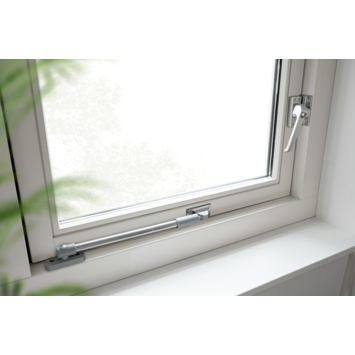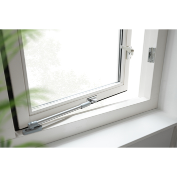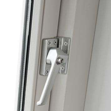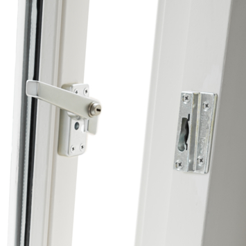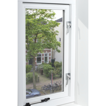 Haakt gelijk in de reeds bestaande kozijnhaak, zodat hij vergrendeld zit en op slot gedraaid kan worden. Geen insluiping mogelijk door het raam.