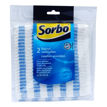 De Sorbo vaatdoeken badstof 2 stuks zijn sterke badstoffen vaatdoeken. De vaatdoeken zijn gemaakt van sterk katoen, badstof, en nemen veel vocht op. Daarnaast zijn de vaatdoeken makkelijk uit te spoelen. De doekjes zijn 35 bij 33 centimeter groot en hebben een streep dessin in geel, zwart, blauw en wit. De doekjes zijn verpakt per 2 stuks.