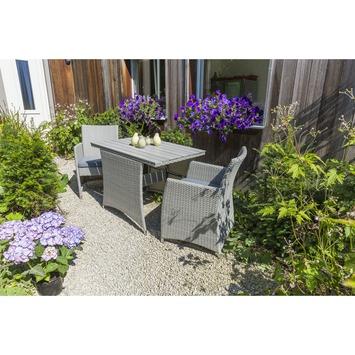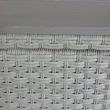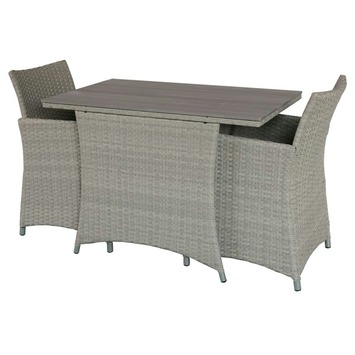 De balkonset Beach is een compacte diningset voor 2 personen. De set is gemaakt van grijs wicker waardoor de set makkelijk reinigbaar is. De set is compact doordat de stoelen deels onder de tafel passen. Het blad van de tafel is gemaakt van aluminium wat ervoor zorgt dat de tafel uitermate duurzaam is. Het frame van de tafel en de stoelen is gemaakt van aluminium. De tafel is 105 centimeter lang, 56 centimeter breed en 76 centimeter hoog. De stoelen zijn 86,5 centimeter hoog, 64,5 centimeter breed en 55 centimeter diep.