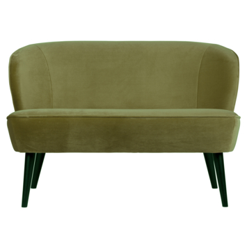 Dit elegante en comfortabele Sara bankje komt uit de collectie van het Nederlandse merk WOOOD. Sara is bekleed met een rijke, volle en duurzame velvet stof (100% polyester) met een stoere army kleur. De poten zijn van berkenhout met een zwarte afwerking.