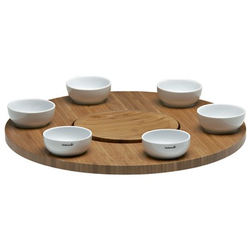 De Barbecook Joya draaiplateau met 6 kommetjes is ideaal voor etentjes met vrienden of familie. Het draaiplateau is gemaakt van bamboehout en de kommetjes van keramiek. Een stijlvolle zet op een mooi gedekte tafel.