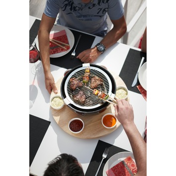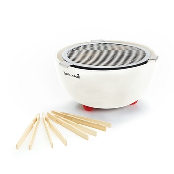 De Barbecook tafelbarbecue Joya wit incl. startpakket is een leuke barbecue die je op tafel kunt zetten om met vier personen van te genieten. De barbecue bestaat uit een binnenkuip van roestvrij staal met daaromheen een keramische buitenkuip die gevuld is met water. Door het water wordt de buitenkant nooit gevaarlijk warm. De siliconen voetjes geven de barbecue iets hoogte en beschermen de tafel tegen onnodige krassen. Het rooster is vaatwasbestendig en is daardoor gemakkelijk schoon te maken. De barbecue heeft een diameter van 31 centimeter en is 15 centimeter hoog. Het braadrooster is 26 centimeter in doorsnede. Tot slot krijg je een startpakket met alvast 650 gram aan grilltabs en vier bamboetangen meegeleverd. De Barbecook tafelbarbecue Joya is ook in zwart verkrijgbaar.
