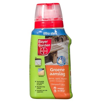 De Bayer Ultra groene aanslag 500 ml verwijdert en voorkomt groene aanslag door de zeer geconcentreerde vloeistof te spuiten of gieten op de plek met aanslag. De groene aanslagbestrijder kan gebruikt worden op onder andere (grind)tegels, grafzerken, muren, daken, hout, kunststof en glas. Voor de optimale toepassing gebruik je de vloeistof in de maanden februari tot en met mei en in oktober of november. Verwijder indien nodig van te voren aanwezig vuil. Gebruik hiervoor geen zeep of synthetisch wasmiddel. Bevochtig vervolgens de te behandelen oppervlakten goed met de klaargemaakte oplossing van Dimanin. Hou er rekening mee dat voor het bevochtigen van poreuze materialen zoals baksteen en trottoirtegels meer spuitvloeistof nodig is dan voor gladde en harde materialen zoals glas. Bij hardnekkige aanslag is het beter om na de behandeling het oppervlak te schrobben. Als na enkele dagen nog dode algen zichtbaar zijn kunnen deze worden verwijderd door het oppervlak af te spuiten of te schrobben. Gebruik de vloeistof niet in vijvers, fonteinen of aquaria.
