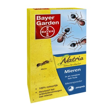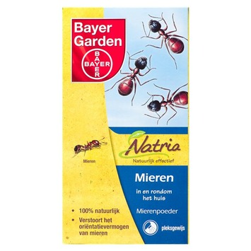 De Bayer Garden Natria mierenpoeder 100 gram bestrijdt snel en effectief mieren in en rondom het huis. Het poeder verstoort het oriëntatievermogen van de mieren, waardoor de mieren de weg naar het nest niet meer terugvinden en dood gaan. De Bayer Natria mierenpoeder bestaat uit natuurlijke grondstoffen. Voor een optimale bestrijding gebruik je de mierenpoeder in de maanden april tot en met augustus. Strooi de mierenpoeder direct in de buurt van de nestopeningen en op de looppaden van de mieren. Indien nodig herhaal je de behandeling na enkele dagen. Wanneer je de mierenpoeder buitenshuis wilt gebruiken, doe dit dan alleen bij droge weersomstandigheden.