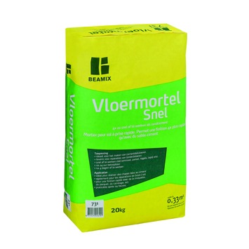De Beamix vloermortel 731 lichtgrijs 20 kg is een zeer snelle vloermortel geschikt voor het maken van cementdekvloeren van 30 tot 50 millimeter. De Beamix vloermortel snel 731 is snel af te werken. Na 24 uur beloopbaar en na 4 dagen af te werken met tegels.