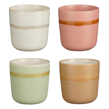 Voeg een vleugje kleur toe aan je serviescollectie met deze beker. Gemaakt van steengoed en verkrijgbaar in de kleuren groen, beige, roze en wit. Aan de buitenkant van de beker zit een donkerkleurige cirkel verwerkt die een leuke touch aan de mok geeft - schattig! De hoogte van de beker zonder oor is 8,5 cm en de diameter is 8 cm.