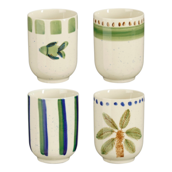 Ontdek deze bekers, verkrijgbaar in vier unieke designs: vis, strepen, palmboom en streep met stippen. Door het groene en blauwe geschilderde effect hebben de bekers een artistiek karakter. Ze zijn gemaakt van steengoed en hebben ieder de afmetingen H9,5 xø7 cm.