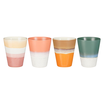 Wat je maar ook inschenkt in deze bekers, als je begint te drinken proeft het zeker vele malen lekkerder en geniet je er van. De vrolijke kleuren roze, donkergroen en bruin doen daar een schepje bovenop en zorgen voor een vrolijke uitstraling. En dat zeker ook op tafel. Maak zo het feest helemaal compleet. De bekers komen in een set van 4, zijn gemaakt van keramiek en hebben als afmeting H10 x ø8,5 cm. De complete set is daarnaast vaatwasserbestendig.