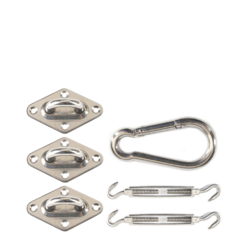 Wil je lang genieten van een schaduwdoek? Dan is het erg belangrijk om deze goed te bevestigen. Met dit Livin' Outdoor Bevestigingsmateriaal voor Driehoek Schaduwdoek RVS kan een driehoek schaduwdoek eenvoudig bevestigd worden aan een muur of paal. De bevestigingsset bestaat uit één karabijnhaak, twee spanners en drie platen met oog.
