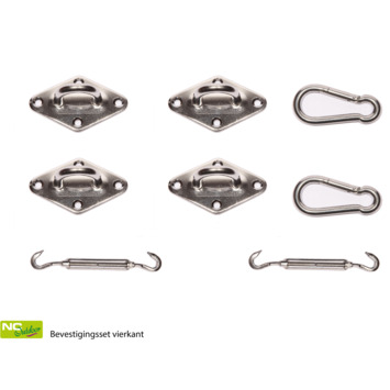 Met de Bevestigingsset RVS t.b.v. schaduwdoek vierkant kun je jouw schaduwdoek vierkant gemakkelijk ophangen. De set bestaat uit twee spanners, vier platen met oog en twee karabijnhaak. Kortom, de bevestigingsset RVS t.b.v. schaduwdoek driehoek de ideale set om snel te genieten van jouw schaduwdoek.
