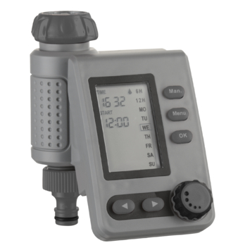 Regel de bewatering van uw tuin automatisch met deze bewateringscomputer. De bewateringscomputer kunt u aansluiten tussen de waterkraan en tuinslang. Met de computer kunt u de sproeitijd instellen, van 1 minuut tot 4 uur. De automatische besproeiingsfrequentie kan worden ingesteld met elke 6 uur, 12 uur, dagelijks, meerdere dagen per week of wekelijks. Voor het gebruik van deze bewateringscomputer zijn AA batterijen nodig. De bewateringscomputer kan op een 3/4”(26,5mm) waterkraan bevestigd worden.
