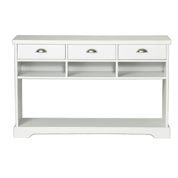 Bijzettafel Digne Provence (lxbxh)120x39x75 cm uit de serie Provence heeft 3 laden en 3 open vakken met daaronder ruimte voor het plaatsen bijvoorbeeld decoratieve manden van stoer rattan. Elke lade is voorzien van solide metalen ladegeleiders. Het materiaal is van hoogwaardig MDF dat in de kleur wit is afgelakt. De lades zijn voorzien van metalen komgrepen. Deze bijzettafel, met de afmetingen 120x39x75 cm (lxbxh), is een mooie aanvulling in de woonkamer en/of handig in de hal/ gang. Een multifuctionele kast die overal geplaatst kan worden: kantoor, woonkamer en/of hal/gang.