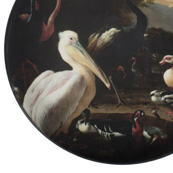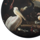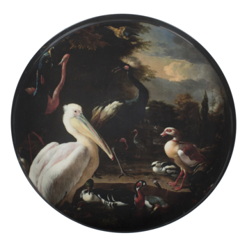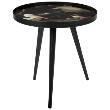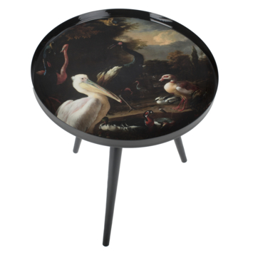 De trendy bijzettafel Fem heeft een zwart emaille tafelblad en is voorzien van print "Het drijvend veertje' van Oud Hollands kunstschilder Melchior d'Hondecoeter. Afmeting (øxh) 41 x 41 cm. Leuk om te combineren met andere tafeltjes als salontafel.