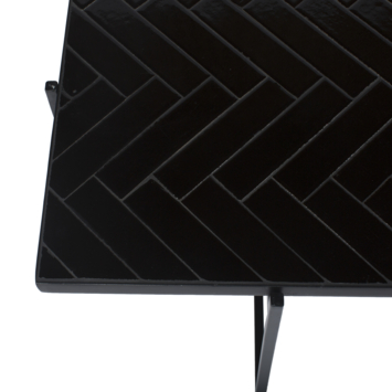 De trendy bijzettafel Tessa heeft een slank zwart stalen frame met een tafelblad van zwarte tegels in visgraatmotief.