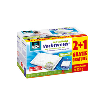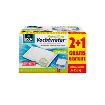 Bison vochtvreter® navulzak neutraal promopack 3x450 gr handige navulzak voor het navullen van Bison vochtvreter. Verlaagt een te hoge relatieve luchtvochtigheid in gesloten ruimtes met weinig of geen ventilatie. O.a. Geschikt voor caravan, boot, schuur, meterkast, zolder, voorraadkast, kelder, kruipruimte, logeerkamer, kledingkast, tuinhuis, keukenkast, kluis en wasruimte.