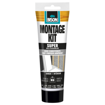 Bison montagekit super hangtube 200 g sterke, universele, oplosmiddelvrije montagelijm. Ideaal voor het eenvoudig en muurvast bevestigen van o.a. Hout, kunststof, metaal, steen, gips, tegels en piepschuim op poreuze ondergronden zoals beton, steen, pleisterwerk, hout en spaanplaat. Blijvend elastisch en vullend. Spijkers en schroeven overbodig.
