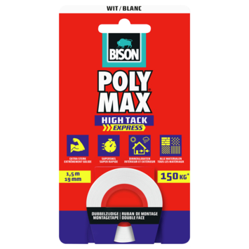 Bison Polymax high tack express montagetape wit 1,5 m x 19 mm is een dubbelzijdige tape voor het permanent bevestigen van voorwerpen op allerlei ondergronden binnen en buiten. De tape is bestand tegen water, uv en alle weersomstandigheden en blijft goed plakken bij temperaturen van 5 tot 40 graden. Dankzij de snelle hechtkracht en blijvende elasticiteit hoef je geen primer te gebruiken, zelfs niet op licht vochtige oppervlakken. Je gebruikt deze tape voor snelle en sterke montage zonder schroeven of lijm.