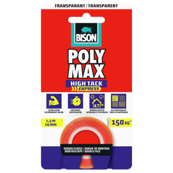 Bison Polymax high tack express montagetape wit 1,5 m x 19 mm is een extreem sterke dubbelzijdige tape voor het permanent bevestigen van voorwerpen binnen en buiten. De tape blijft stevig zitten bij temperaturen tussen 5 en 40 graden en is bestand tegen uv, water en alle weersomstandigheden. Je kunt hem gebruiken op licht vochtige ondergronden zonder primer. Dankzij de snelle hechting en blijvende elasticiteit is deze tape geschikt voor allerlei materialen en toepassingen.