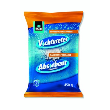 Bison vochtvreter® losse kristallen neutraal zak 450 g losse kristallen voor het navullen van bison vochtvreter. Verlaagt een te hoge relatieve luchtvochtigheid in gesloten ruimtes met weinig of geen ventilatie. O.a. Geschikt voor caravan, boot, schuur, meterkast, zolder, voorraadkast, kelder, kruipruimte, logeerkamer, kledingkast, tuinhuis, keukenkast, kluis en wasruimte.