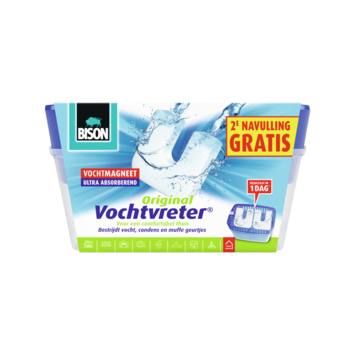 Deze Bison vochtvreter 900 gr met 2de navulling gratis is ideaal tegen overtollig vocht. De vochtvreter bestrijdt vocht, condens & muffe luchtjes, hiermee wordt schimmelvorming en een slechte luchtkwaliteit tegen gegaan.