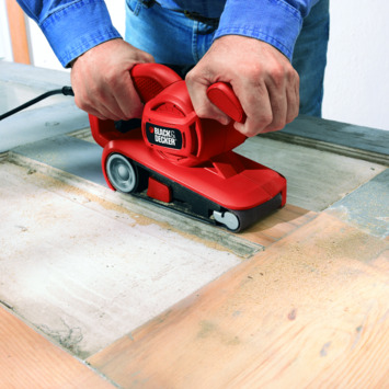De Black & Decker bandschuurmachine KA86-QS is geschikt om grote oppervlakten schuren van bijvoorbeeld vloeren en lambrisering. De machine heeft een krachtige 720 watt motor. Door de handige automatische bandcentrering loopt het schuurpapier niet van de band af. De bandschuurmachine heeft een stofzak die het stof opvangt die vrij komt bij het schuren. Ideaal om zo veel mogelijk stofvrij te kunnen werken. Je hebt een groot bereik met het extra lange snoer van 3 meter. Dan kan je makkelijker een groot oppervlakte bewerken. De Black & Decker bandschuurmachine KA86-QS is dus de ideale schuurmachine voor in en rond je huis.