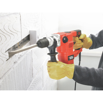De Black & Decker pneumatische boorhamer KD1250K is een echte alleskunner. Met zijn krachtige vermogen van 1250 watt, maximaal aantal toeren van 850 per minuut en slagkracht van 3,5 joules, boor je gemakkelijk en gecontroleerd in steen en beton. Zijn sterke pneumatische hamermechanisme levert tot 4100 slagen per minuut. Het aantal slagen is variabel instelbaar. Het SDS-systeem zorgt voor snel en zonder gereedschap vervangen van het inzetgereedschap. Met het tweede handvat heb je extra goede grip tijdens het boren. De Black & Decker pneumatische boorhamer KD1250K wordt geleverd in een praktische kunststof koffer.