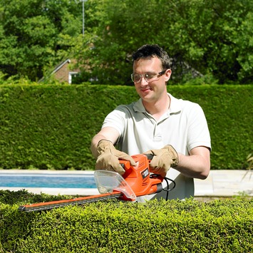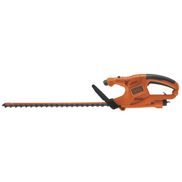 De BLACK+DECKER 450W heggenschaar (GT4550-QS) met 50cm zwaardlengte en 18mm snijbreedte maken deze heggenschaar het meest geschikt voor het snoeien van kleinere heggen. Het metalen zaagblad is zeer robuust en scherp en de tanden zijn in een hoek geplaatst waardoor deze zorgen voor optimale snijprestaties. De in 5 posities verstelbare T-handgreep zorgt voor extra comfort en controle. Deze heggenschaar is ontworpen met als centrale thema’s comfort en veiligheid tijdens het gebruik en is alleen met 2 handen te starten en daardoor beveiligd tegen per ongeluk starten van de heggenschaar. De gebruiksvriendelijke snoergeleiding zorgt ervoor dat het snoer niet in de weg zit tijdens het werken en de kabelklem zorgt voor een veilige geleiding van het snoer. Het ontwerp is zeer gebalanceerd waardoor er een gelijke gewichtsverdeling is tussen blad en handgreep.