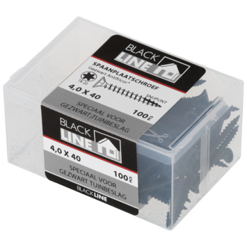 Blackline gezwarte spaanplaatschroeven met platverzonkenkop en TX-aandrijving zijn van professionele kwaliteit: extra sterk én tevens flexibel. De schroeven hebben een voorborende snijpunt. Dit type boorpunt neemt het restmateriaal mee uit het schroefgat tijdens het inschroeven waardoor het splijten van het hout wordt voorkomen. De speciale zwarte HCP (High Corrosion Protection) coating zorgt voor een zeer goede roestbestendigheid en dat maakt deze bevestigingsartikelen geschikt voor buitengebruik.
