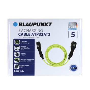 Blaupunkt Electric Verhicle 1 Fase laadkabel voor type elektrische auto. Met de 32 ampère capaciteit laadt het veilig op tot 7.4 KW. De Blaupunkt oplaadkabels zijn ontworpen volgens de IP54-classificatie, waardoor de kabel veilig is om buitenshuis te gebruiken bij alle weersomstandigheden. De totale lengte van 8 meter biedt maximale flexibiliteit. Een handige transport en beschermende draagtas is inbegrepen.