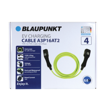 Blaupunkt Electric Verhicle 3 Fase laadkabel voor type elektrische auto. Met de 16 ampère capaciteit laadt het veilig op tot 11 KW. De Blaupunkt oplaadkabels zijn ontworpen volgens de IP54-classificatie, waardoor de kabel veilig is om buitenshuis te gebruiken bij alle weersomstandigheden. De totale lengte van 8 meter biedt maximale flexibiliteit. Een handige transport en beschermende draagtas is inbegrepen.