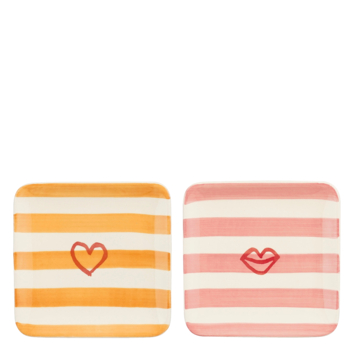 Met dit Bliss bord voeg je een kleurrijke touch toe aan je serviescollectie. Het vierkante bordje is gemaakt van steengoed en verkrijgbaar in oranje met strepen en een hartje, of in roze met strepen en lippen. Met een lengte en breedte van 14 cm en een hoogte van 2 cm is dit bordje perfect voor kleine hapjes of gebakjes – feestelijk!
