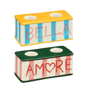 Breng een vleugje Italiaanse charme in je interieur met de Bliss kandelaar. Deze vrolijke kandelaar, verkrijgbaar in groen of geel, is geschikt voor twee kaarsen en past perfect bij het Bliss-servies. Met speelse strepen en de teksten 'Bella' of 'Amore' voegt hij direct een leuke sfeer toe aan je eetkamer of woonkamer. Gemaakt van stevig steengoed en met compacte afmetingen van L11 x B5 x H5 cm. Ideaal als gezellige en stijlvolle tafeldecoratie!