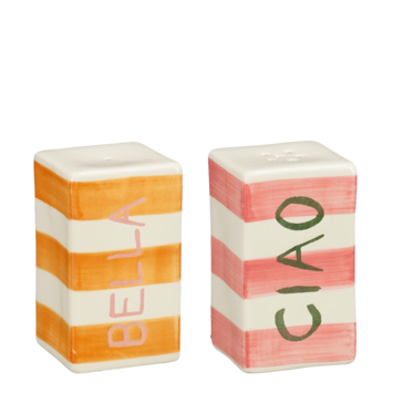 Voeg een speelse Italiaanse touch toe aan je tafel met het Bliss zout- en peperstel. Dit vrolijke duo is gemaakt van stevig steengoed en uitgevoerd in de kleuren geel en roze, versierd met de woorden 'Bella' en 'Ciao'. Ideaal om je eettafel op te fleuren en perfect te combineren met het overige Bliss-servies. Met afmetingen van L5 x B5 x H8,5 cm liggen de vaatjes prettig in de hand en zorgen ze voor een charmante uitstraling tijdens elke maaltijd. Een leuke toevoeging aan elke gedekte tafel!