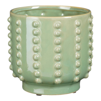 Deze bloempot is een vrolijke en tegelijk een stijlvolle toevoeging aan ieder interieur. De groene bloempot is gemaakt van stevig keramiek en valt op door de gebobbelde structuur aan de zijkant. De pot voor binnen is 100% handgemaakt en hierdoor uniek, een echte blikvanger! Met een hoogte van 16,5 cm en een diameter van 17,5 cm is hij zeer geschikt voor de meeste levende binnenplanten en kunstplanten. Let op: Omdat dit een handgemaakt product is, kan de kleur, maat of vorm bij ieder item iets afwijken. Daarnaast zijn keramieken potten poreus en nooit 100% waterdicht. Wij raden daarom aan een schotel of plastic binnenpot te gebruiken.