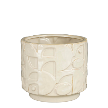 Deze bloempot is werkelijk uniek! Deze prachtige pot is van hoogwaardig keramiek en heeft een glanzende afwerking. Door de verschillende texturen is deze plantenpot echt een statement piece! Plaats hem op een brede bedrand, op de vensterbank of in een open wandkast: hij staat overal mooi! Dit model is off white en heeft een hoogte van 18,5 cm en een diameter van 21 cm en in de pot past een kweekpot van 19 cm.