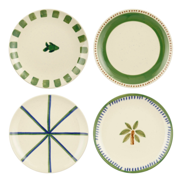 Ontdek deze borden, verkrijgbaar in vier unieke designs in het groen en in het blauw. Door het geschilderde effect hebben de borden een artistiek karakter. Ze zijn gemaakt van steengoed en hebben ieder de afmetingen H3 xø25 cm.