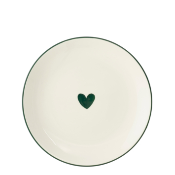 Dit keramieken bord brengt een vleugje liefde op tafel. In het midden schittert een groen hartje, omlijst met een bijpassende rand. Perfect voor ontbijt, gebak of een lunch. Het frisse ontwerp maakt van elk eetmoment iets bijzonders. De afmetingen zijn H1,5 x ø20,5 cm.