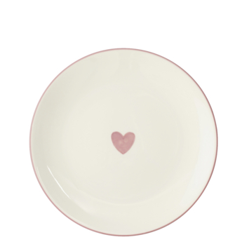 Dit keramieken bord brengt een vleugje liefde op tafel. In het midden schittert een zachtroze hartje, omlijst met een bijpassende rand. Perfect voor ontbijt, gebak of een lunch. Het frisse ontwerp maakt van elk eetmoment iets bijzonders. De afmetingen zijn H1,5 x ø20,5 cm.