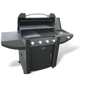 De Boretti barbecue Robusto is een stoere matzwarte gasbarbecue. De deksel met ronde vorm aan de binnenkant van de klep maakt het mogelijk om de warmte perfect te circuleren zodat je kunt koken met de juiste temperatuur. De barbecue heeft twee afzetvlakken waar bijvoorbeeld schalen en glazen op gezet kunnen worden. Het rechter afzetvlak heeft een extra zijbrander waarop gerechten in een pan bereid kunnen worden. De Robusto barbecue heeft zowel een grillrooster als een bakplaat. Achter de deur kun je de gasfles, barbecuegereedschap en andere benodigdheden opbergen. Een gasdrukregelaar wordt bijgeleverd. Kortom tover je met de Boretti barbecue Robusto in een handomdraai een compleet feestmaal op tafel. Boretti barbecue Robusto is 127 centimeter hoog, 91 centimeter breed en 64 centimer diep.