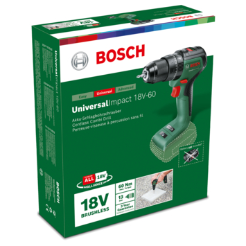 De compacte UniversalImpact 18V-60 is de klopboorschroevendraaier die enthousiaste doe-het-zelvers kiezen voor langdurig klopboren, boren en schroeven in een groot aantal materialen. Borstelloos motorvermogen, meerdere draaimomentstanden en een robuuste metalen boorhouder van 13 mm garanderen optimale prestaties. Pak meerdere projecten probleemloos aan met het indrukwekkende boorvermogen en uithoudingsvermogen van de UniversalImpact 18V-60. Deze lichte allrounder beschikt over 20 draaimomentstanden, een aandrijving met twee standen en klopboormodus voor een grotere flexibiliteit en controle. Borstelloze motortechnologie van Bosch is de kracht achter de gigantische prestaties van deze machine: soepel en snel draait deze schroeven vast en drijft boren in houten planken, metaal en metselwerk, waarbij meer comfort is gegarandeerd. Vaklui zullen dankbaar zijn voor de robuuste boorhouder van 13 mm, die gemaakt is van metaal om boren en schroeven goed op hun plek te houden. Het gereedschap maakt deel uit van de power for all alliance. Eén accu kan een groot aantal machines/apparaten van verschillende merken laten werken.