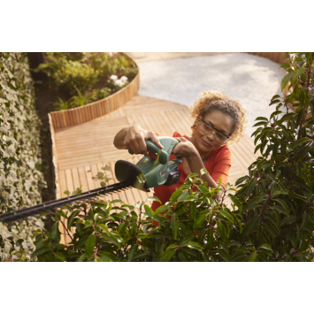 De EasyHedgeCut 18-45 is perfect voor het onderhoud en snoeien van kleine en middelgrote heggen. Hij heeft een uitzonderlijk laag gewicht van 2,3 kg met een ergonomisch ontwerp voor comfortabel hanteren in diverse posities tijdens het werken, voor minder belasting van het bovenlichaam bij langer werken met het gereedschap. De Li-Ion-accu van 18 V levert een optimaal vermogen in combinatie met het Bosch 'Anti-Blocking'-systeem om te zorgen voor uitstekende omstandigheden voor zuiver, krachtig en continu snoeien zonder frustrerende tegenslagen zoals afslaan van de motor. Snoerloze mobiliteit maakt bewegingsvrijheid in de tuin mogelijk zonder de beperking of het risico van doorsnijden van netsnoeren.
