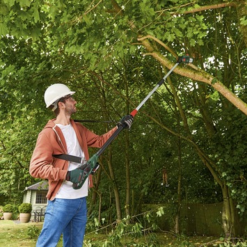 De Bosch accu hoogsnoeier UniversalChain 18 is ideaal voor het snoeien van moeilijk bereikbare takken. Door de verstelbare kop en telescoopstang van 2,1 tot 2,6 meter hoog, zaagt deze machine moeiteloos door zelfs de hoogste takken. De tipbeschermer en bumperspike zorgen voor een betere controle. De ketingzaag werkt op een 18V / 2,5Ah Lithium-Ion accu, waardoor u gelijk aan de slag kunt zonder het gebruik van verlengsnoeren. Door het ergonomische, goed gebalanceerde en lichtgewicht design werkt u probleemloos en langdurig door zonder belasting op de armen en schouders. Met het zwaard van 20 cm snoeit u takken met een dikte tot 15 cm. Door de oliepeilindicatie en automatische kettingsmering wordt er voorkomen dat uw machine droogloopt.