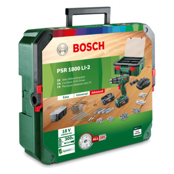 De Bosch accu boormachine PSR1800 in SystemBox is de perfecte totaaloplossing voor doe-het-zelvers die de voorkeur geven aan een zeer praktisch systeem voor het schroeven en boren.