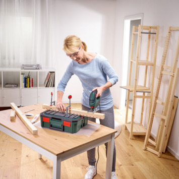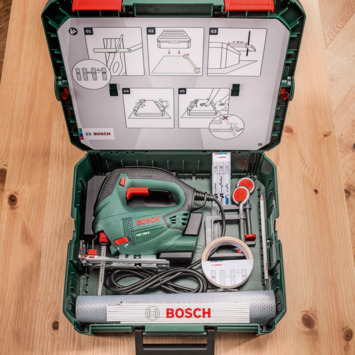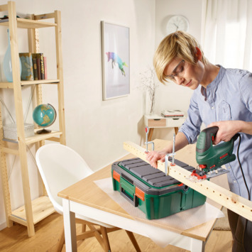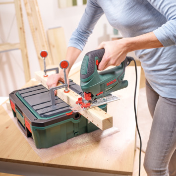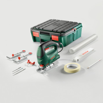 De Bosch decoupeerzaag PST 700 E is een krachtige en praktische decoupeerzaag van Bosch. Door het ontwerp is deze eenvoudig te hanteren. De traploze regeling van het aantal zaagbewegingen via de gasgeefschakelaar maakt het mogelijk om behoedzaam te beginnen met zagen in alle materialen. Met deze decoupeerzaag kun je tot 70 millimeters in hout 10 millimeter in aluminium. De Bosch systeembox kunt u eenvoudig gebruiken als werktafel d.m.v. de meegeleverde klemmen. De Bosch decoupeerzaag wordt geleverd in een praktische SystemBox. De SystemBox is stapelbaar en volledig flexibel in te richten en door de hendel is de box ook gemakkelijk te transporteren. In de Systembox kunnen aparte accessoire boxjes worden geplaatst waardoor deze naar wens kan worden ingericht. De systeembox is al voorzien van 3 zaagbladen, 2 klemmen, anti slipmat een potlood en een duimstok. De box is al voorzien van de eerste extra accessoires. Kortom: De Bosch decoupeerzaag PST 700 E SystemBox heeft alles in één gereedschapskoffer voor alle klussen!