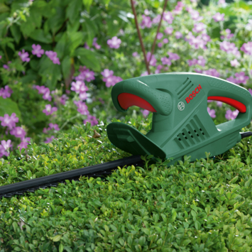 De lichte, elektrische heggenschaar EasyHedgeCut 46 van Bosch is ontwikkeld voor gebruikersgemak. Met deze praktische en goed uitgebalanceerde heggenschaar kunt u comfortabel werken in elke positie. Dankzij de hogesnelheidsmotor, de zwaardlengte van 45 cm en de mesafstand van 16 mm levert de heggenschaar EasyHedgeCut 46 uitstekende prestaties. De heggenschaar is ideaal voor het snoeien van kleine heggen. Door de krachtige 420W motor met hoog prestatievermogen worden uitstekende snoeiprestaties geleverd.